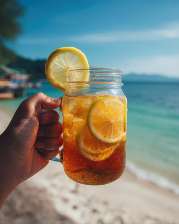 close up of hand holding mason jar filled with iced tea and lemon slices, condensation on glass, blurred beach background, Generative AI