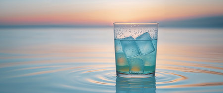 AI Generated. Iced drink with bubbles in glass on water at sunset