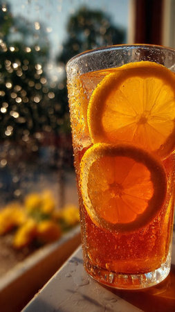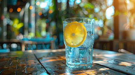 Refreshing Summer Drink with Lemon Slice in Sunlit Cafe Setting