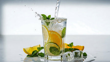 Crystal-clear water cascades into a glass filled with fresh lemon, lime, orange slices, and mint leaves, chilled with ice cubes for a revitalizing summer drink.