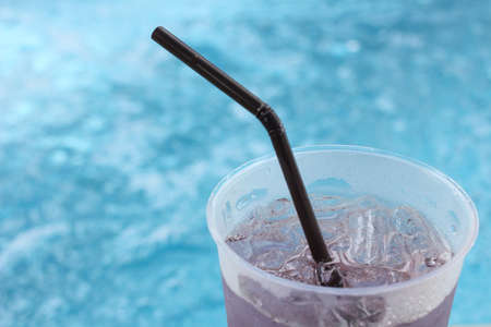 iced coffee and sea, Iced black coffee americano in take away cup (plastic glass) on the beach background