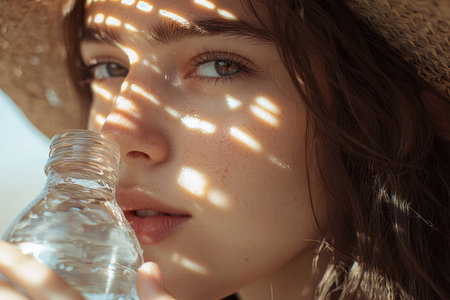 Beautiful young woman drinking water, feeling refreshed under sunlight with soft shadows, healthy lifestyle concept, summer vibes, natural skincare