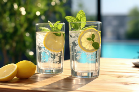 Crystal clear glass bottle with refreshing lemon slices and mint leaves. Healthy hydration concept for a vibrant lifestyle, promoting wellness and detox. High quality photo