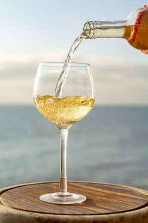 Waiter pouring aperitif cold white wine in glasses on outdoor tessace witn sea view in sunny day