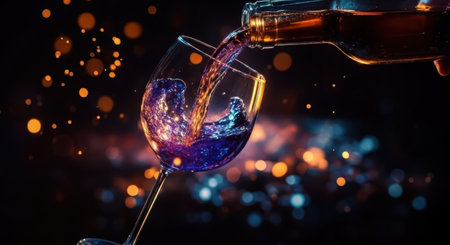 A dark, moody shot captures liquid being poured into a wine glass, with vibrant bokeh lights creating a festive atmosphere.