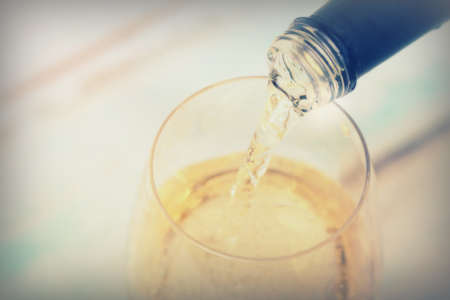 Glass of white wine being poured from a bottle
