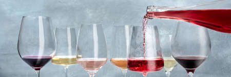 Wine panorama with rose wine poured into a glass at a tasting, with white and red wine of different colors. Winetasting event