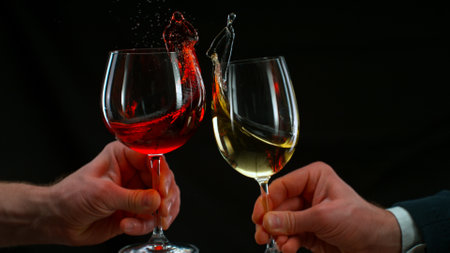 Red, and white wine leaping from glasses in a mid-air splash, isolated on black