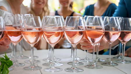 These stunning glasses of ros wine symbolize the spirit of togetherness and celebration at a lively party. The vibrant color of the wine reflects the warmth and joy shared among friends during this delightful occasion.