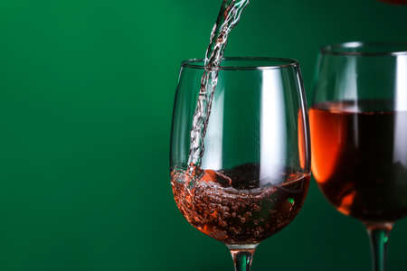 Pouring of tasty wine into against color background