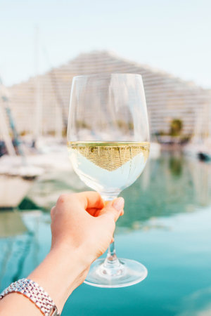 Woman hand with white wine, champagne glass on yachts, sailing boats background. Nice, France.