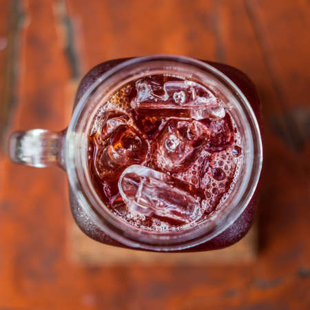 Cold drink black tea of raspberry lemonade with mint in glass. Selective focus