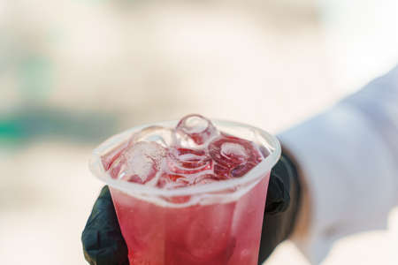 Red lemonade with ice cubes in plastic cup close-up in waiters hand with black gloves.