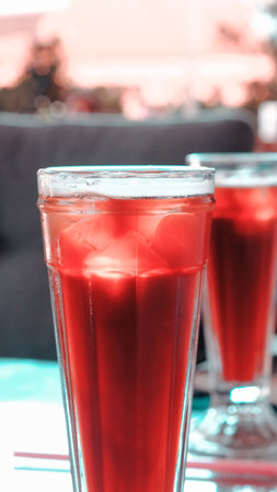 Red lemon soda water flavoured drink, Cool Drinks Beverages with ice in clear glass on white table