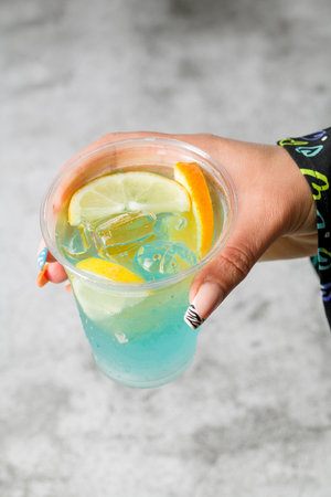 Woman holding bubble tea with lemonade in front of gray stone wall