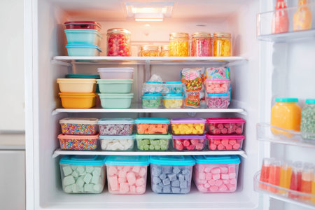A well-organized freezer in a cozy kitchen showcases vibrant containers filled with a variety of frozen snacks, creating a delightful visual treat.