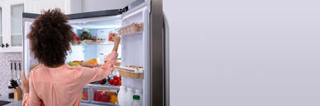 Rear view of curly haired woman opening refrigerator full of fresh fruits and vegetables, searching for food late at night, standing in modern kitchen