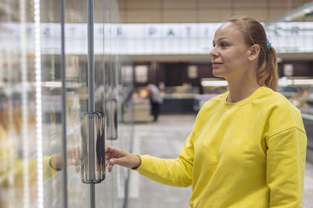 a cheerful girl of European appearance with blond hair tied in a ponytail with a blue elastic band in a yellow jacket, chooses products in a refrigerated display case in a grocery store