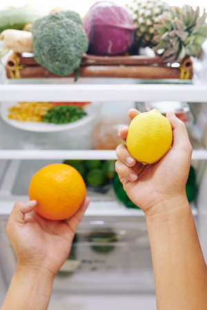 Man choosing citrus fruit for refreshing drink, he is taking orange and lemon out of fridge