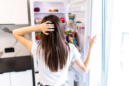 Woman stands in front of an open refrigerator during the night searching food for to eat. Night hunger