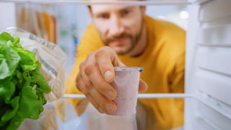 Camera Inside Kitchen Fridge: Handsome Man Opens Fridge Door, Takes out Yogurt. Man Eating Healthy. Point of View POV Shot from Refrigerator full of Healthy Food