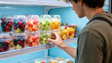 Young adult grabbing multi-fruit mixture of colorful cubed watermelon, melon, and various berries packaged in clear disposable cups from a bright, blue-lit refrigerated store section.