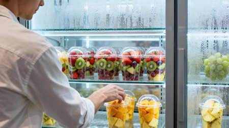 Side view of a male employee stocking layered strawberry, kiwi, and grape fruit salad cups, along with mango and pineapple chunks, within a brightly lit, condensation-covered commercial refrigerated...