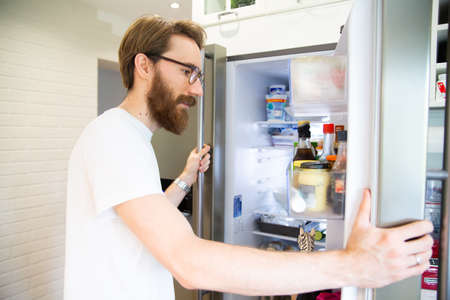 Man looking into an open home fridge, a refrigerator, close up, side view.