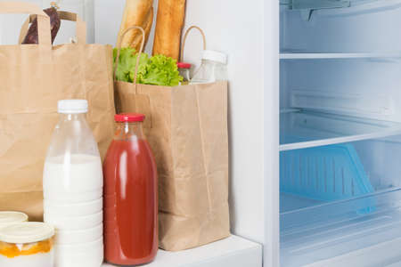 Refrigerator full of food and drinks, closeup of photo