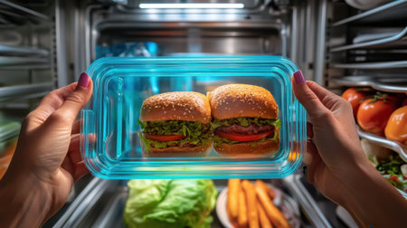 Two sliders resting in a glass container showcase a vibrant and healthy meal option, highlighting fresh ingredients surrounded by colorful vegetables in a refrigerator.