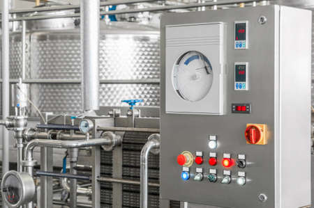 electronic control panel and tank at a milk factory. equipment at the dairy plant