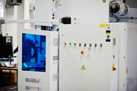 Touch screen control panel of modern industrial machine. Selective focus.