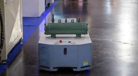 Automated robot handling product in smart factory. AGV Automatic Guided Vehicle transporting equipment in modern warehouse.