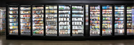 Frozen goods area in a supermarket, long refrigerated display cases with goods