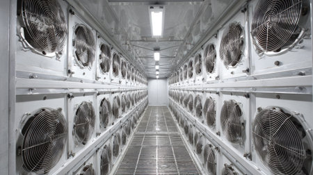 Industrial storage facility featuring a long aisle of high-efficiency cooling fans. The clean, bright environment highlights advanced refrigeration technology.