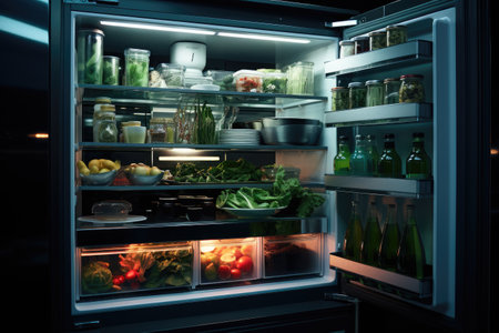 Modern kitchen with smart refrigerator interior displaying organized fresh produce. That the image is generated using AI.