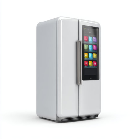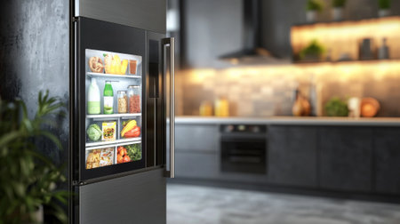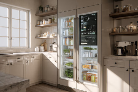 Modern kitchen featuring a smart refrigerator with a digital display showing nutritional information, enhancing meal planning and promoting healthy eating habits