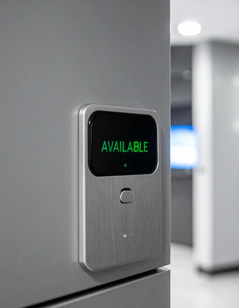 In a sleek, modern facility, a smart locker's green digital display brightly signals 'Available.