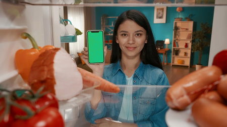 Portrait of asian woman showing smartphone green screen close up. A woman stands at an open refrigerator with groceries, inside view. Advertising area, workspace layout.