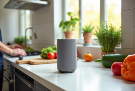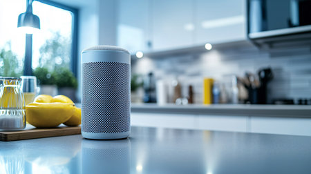 Speaker in bright modern kitchen beside fruit bowl and smart display