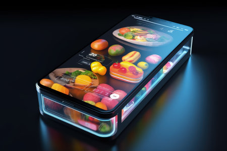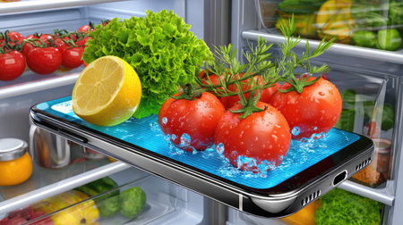 A vibrant smartphone displays fresh tomatoes, lettuce, and lemon with a splash effect, symbolizing healthy eating and modern digital lifestyle in a refrigerator.