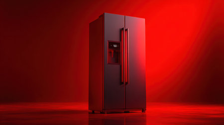 A striking black refrigerator featuring a water dispenser, illuminated against a bold red backdrop, creating a modern and sophisticated kitchen atmosphere for your projects.