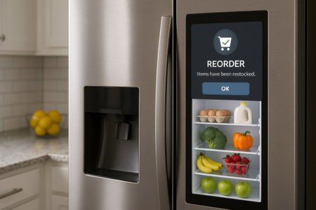 Modern kitchen featuring smart refrigerator confirming grocery restock via online order, showcasing convenience and efficiency of home automation