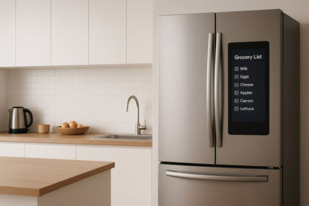 Modern kitchen featuring a smart refrigerator with a digital display showing a grocery list, highlighting the convenience of technology in home management
