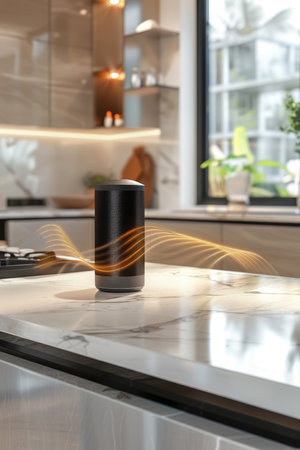 Premium Smart Speaker Displaying Golden Sound Waves on Marble Countertop in Modern Kitchen