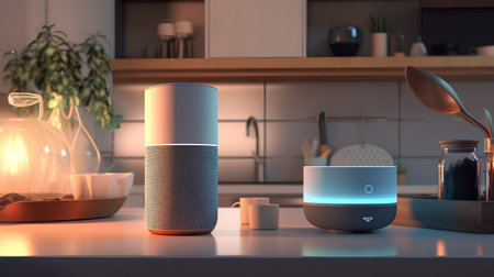 Home smart speaker technology. Voice assistant with AI powered communication in house.
