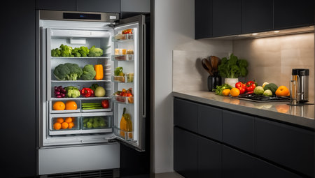 Experience a modern kitchen scene featuring a sleek refrigerator filled with vibrant, fresh food. Inviting ambiance highlighting culinary creativity and organization.