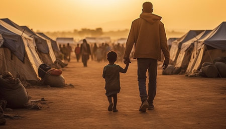 A family of refugees walks along a dusty road at sunset, carrying their belongings. The poignant image symbolizes migration, displacement, and the hope for a new beginning. The setting sun casts long