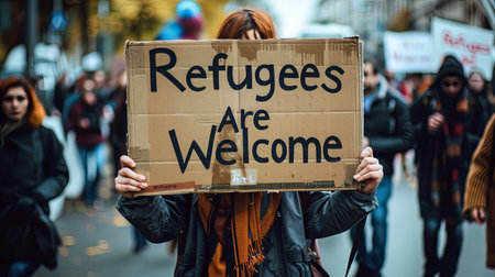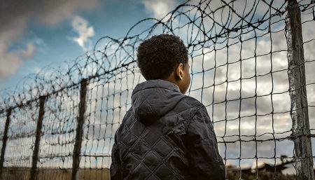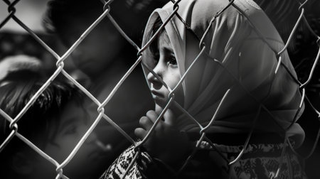 A poignant scene depicting refugees at a border fence, highlighting the human cost of displacement and seeking asylum.