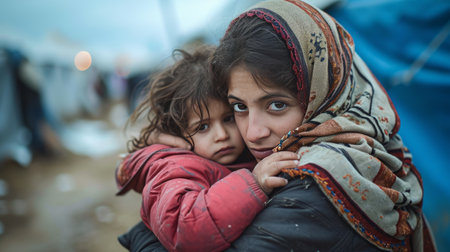 immigrant mother hug her child in an immigrant camp AI generated